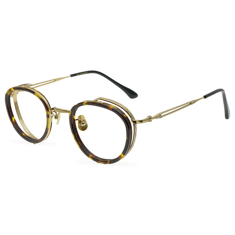 Round Titanium Tortoise Glasses Frames Men Eyeglasses Carved Texture Double Frame Personalized Eyewear